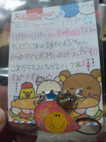 サプライズで真綾と和馬が携帯ストラップのプレゼントをくれました。