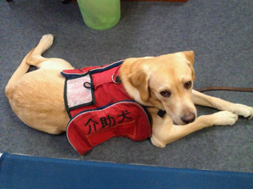 もう介助犬??って画像ですが、これも訓練のひとつ。「お仕事中」のベストをいやがらずに着るお稽古だそうです。