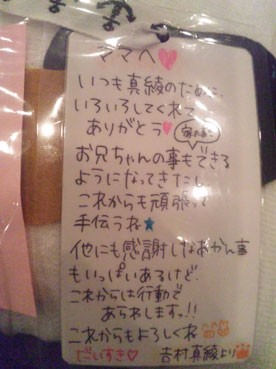 感謝のつどいで真綾からママにプレゼントしたのは家庭科の時間に作ったてづくりの猫のデザインのクッション!
