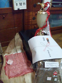超豪華な優勝カップ! そして副賞は、徳志満の霜降り高級牛1キロ。 プラス霜降りステーキ4枚! 最高! |