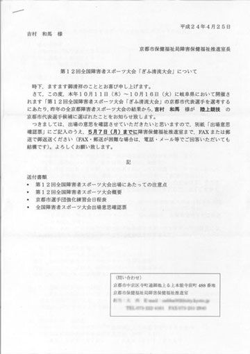 去年の秋に金沢のライブ翌日、早朝から飛んでかえって、半ばひやかしで出場した全京都障害者スポーツ大会の結果で、秋に岐阜でおこなわれる「第12回全国障害者スポーツ大会」の京都市代表選手候補に選ばれたらしい。