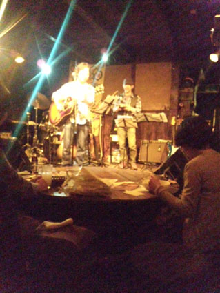 じつは、とんぼ先生が最近やっているサンシン教室のあと、元田中にある「伊予船」というお寿司屋さんで、たまたま居合わせた豊田勇造さんと出会い、意気投合してライブに行く約束をしたということ。
