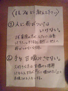 今回の里帰りでの、トレーナーさん手書きの注意書きをもらいました。