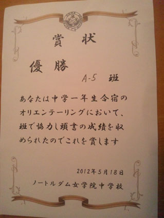 真綾が先日、希望ヶ丘で行われたノートルダム女学院中学校の合宿のなかで行われたオリエンテーリングのチーム優勝の賞状をいただいてきました。