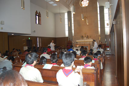 礼拝堂に各隊の制服が並びクリスマス礼拝を行います。その後、入隊式。この日に入隊したスカウトは礼拝堂で入隊式をしてもらえるので思い出に残るものになります。