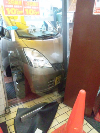 みれば30歳前後のおねえさん運転の車が、駐車場の車止めを乗り越えてお店の入り口へ!