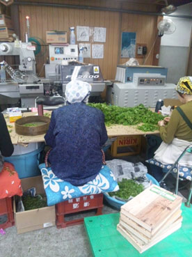 美味しい筈です。完全手作業!写真のように社長のお母様である大奥様を筆頭に近所のパートのおばちゃんたちが黙々と木の芽の選別を!