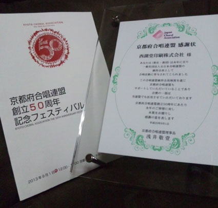 全日本合唱連盟維持会員のわが西湖堂印刷株式会社が感謝状をいただくことになり、大ホールのステージ上で浅井理事長から感謝状をいただきました。