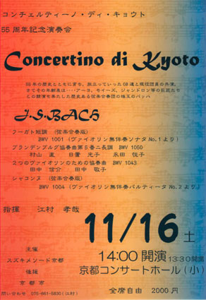 11月16日(土)14:00よりコンサートホールで真綾属するコンチェルティーノ・ディ・キョウトの演奏会があります。