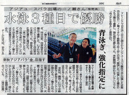 このたびマレーシアでのアジアユースパラで4種目中3種目優勝の快挙を挙げてかえってきた記事が10月8日の京都新聞に載っています。